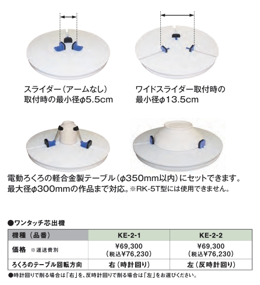 高台削り用として。電動ろくろの軽合金製テーブル(φ350mm以内)にセットできます。最大径φ300mmの作品まで対応。※RK-5T型には使用できません。 ※送料はお問い合わせください